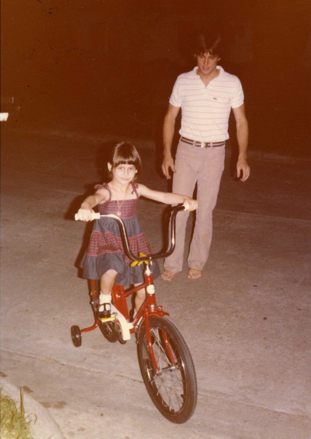 In it I’m perched on a brand new bike, cherry red with the training wheels still on, my hands grasping the arched handlebars in a determined way, like I have places to go. I’m pretty sure I had just received it as a Christmas present, as there is still one of those fuzzy 70s ribbons tied onto it. I’m pretty sure I’m still all dressed up for Christmas given that I’m wearing a red and green dress plus patent leather t-straps (with socks!) and I was generally forced into dresses for special occasions against my will when I was growing up. (The fact that it’s a sundress doesn’t mean it wasn’t Christmas since I grew up in Houston and we were often in t-shirts in December.) I’m pretty sure I’m five in the photo.
